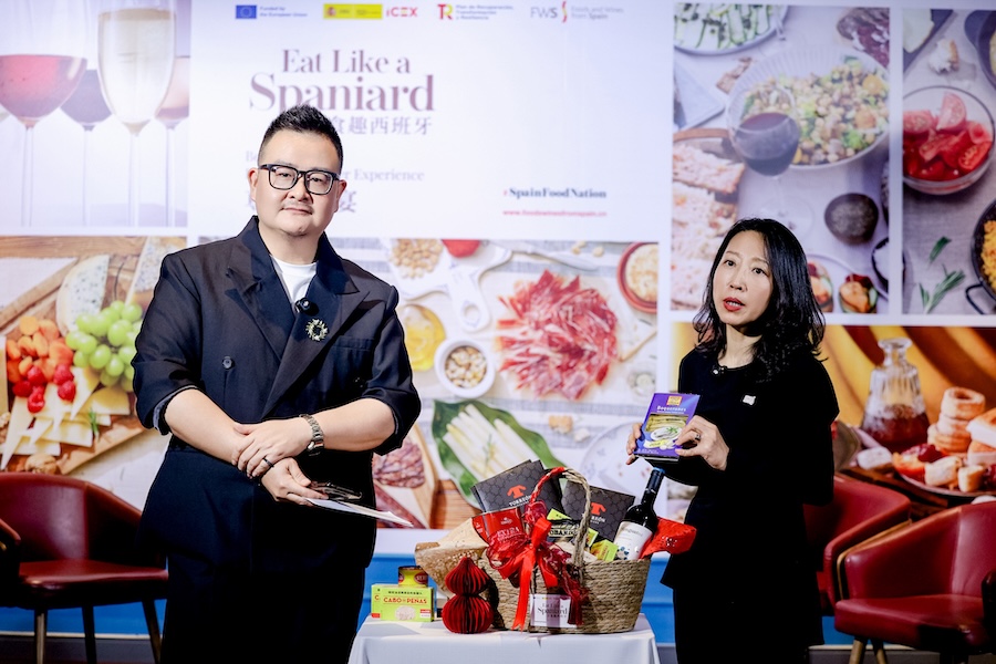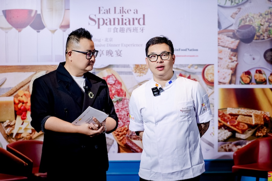 晚宴正式开席前,官方还在现场同步开启了一场氛围热烈的预热直播。直播期间,北京地区品牌大使朱文渊大厨率先惊喜现身直播间,提前为大家剧透了当晚定制菜单的灵感巧思;随后,西班牙驻华大使馆经济商务处经济商务参赞贺明远先生(Mr. Ernesto Negredo)也亲自入镜,向屏幕前的网友热情致辞;伴随着多轮福利丰厚的实时互动抽奖,直播间的气氛被频频推向高潮,将这份来自伊比利亚半岛的美食热情完美传递给了广大线上观众。