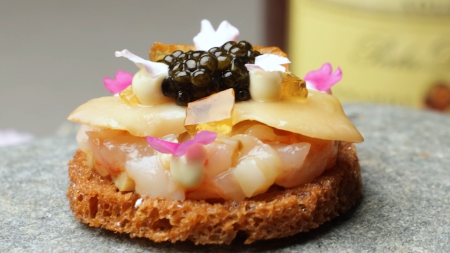 装盘的每一步都如同一件艺术品的诞生。用澄清黄油将圆形面包片炸至金黄酥脆作为基底,依次放上鲜甜的红虾丁与饱满的贝肉,挤上佛手柑白兰地啫喱与柔滑的凤尾鱼酱。最后,用紫苏与葱碎轻轻点缀。一口咬下,酥脆的面包、西班牙红虾的鲜甜与白兰地的醇香在舌尖交织,回味悠长。