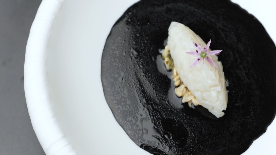 装盘时,深黑色的墨鱼汁酱铺底,放上带有焦香的炙烤鱿鱼卷,点缀上紫苏麦仁混合物。最后,用清新的地肤子与可食用小花加以装饰。一道融合了海味醇厚与谷物清香的佳肴,便立体地呈现在眼前。